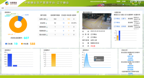 (4)安全生产管理平台:通过智能AI监控探头可以实时检测厂区作业区域、易发生安全事故区域人员是否有佩戴安全帽、穿着工作服、人员倒地检测、烟火事故报警情况监测,监测到报警信息后可推送到安全管理人员的中粮E+APP上,由专职安全管理人员第一时间进行响应处置。