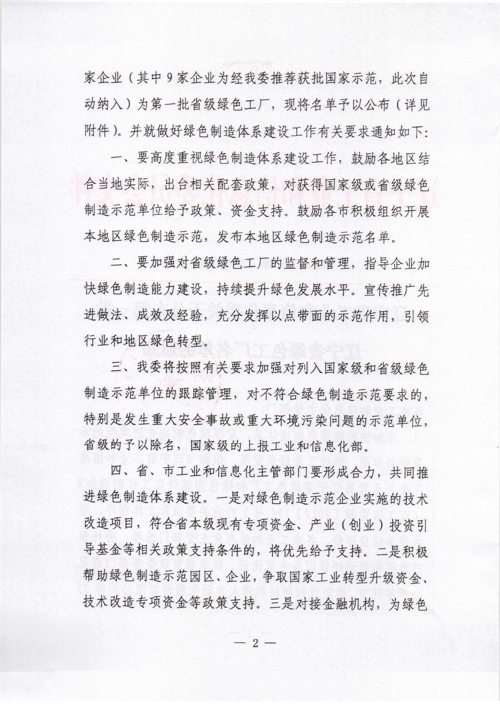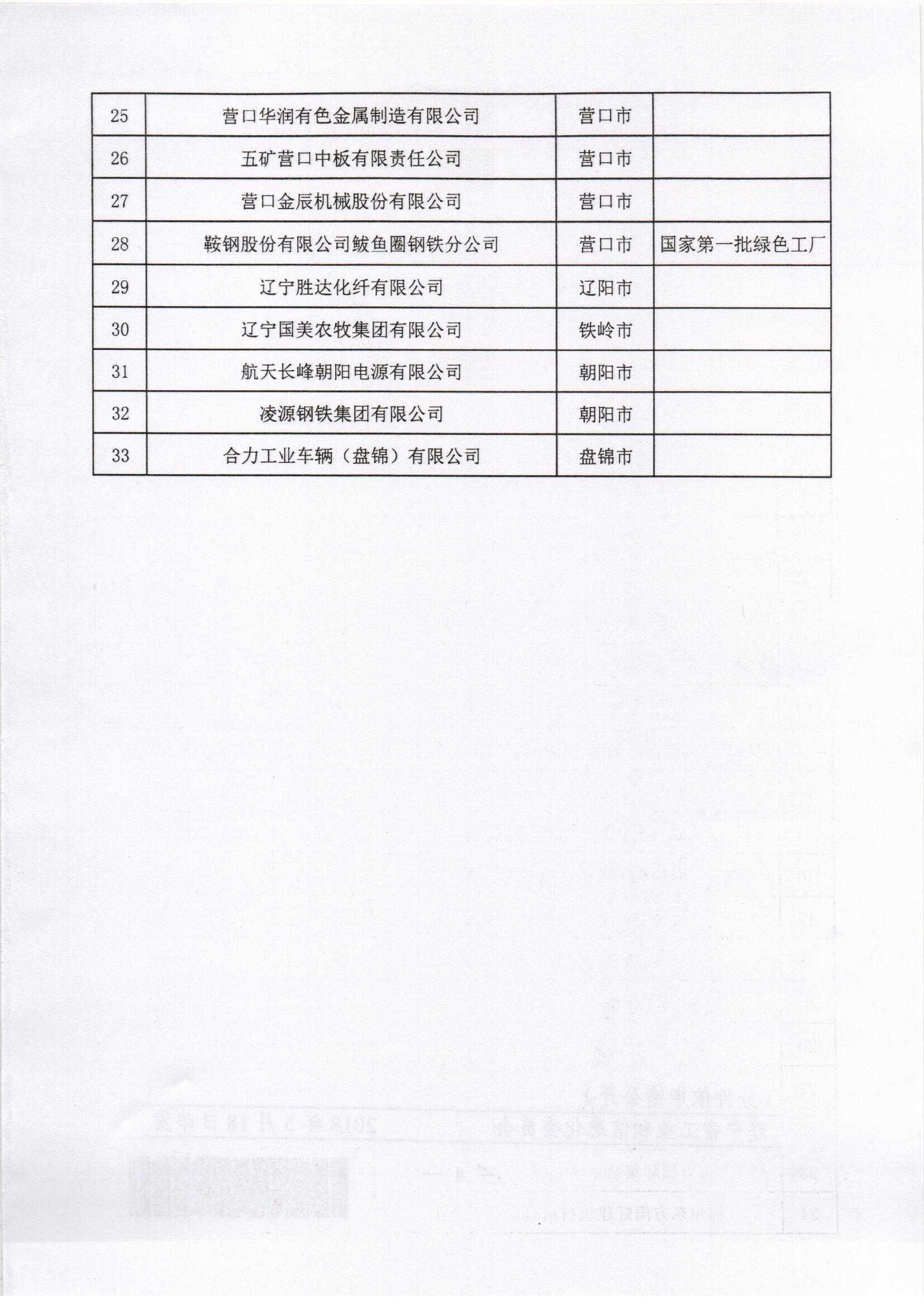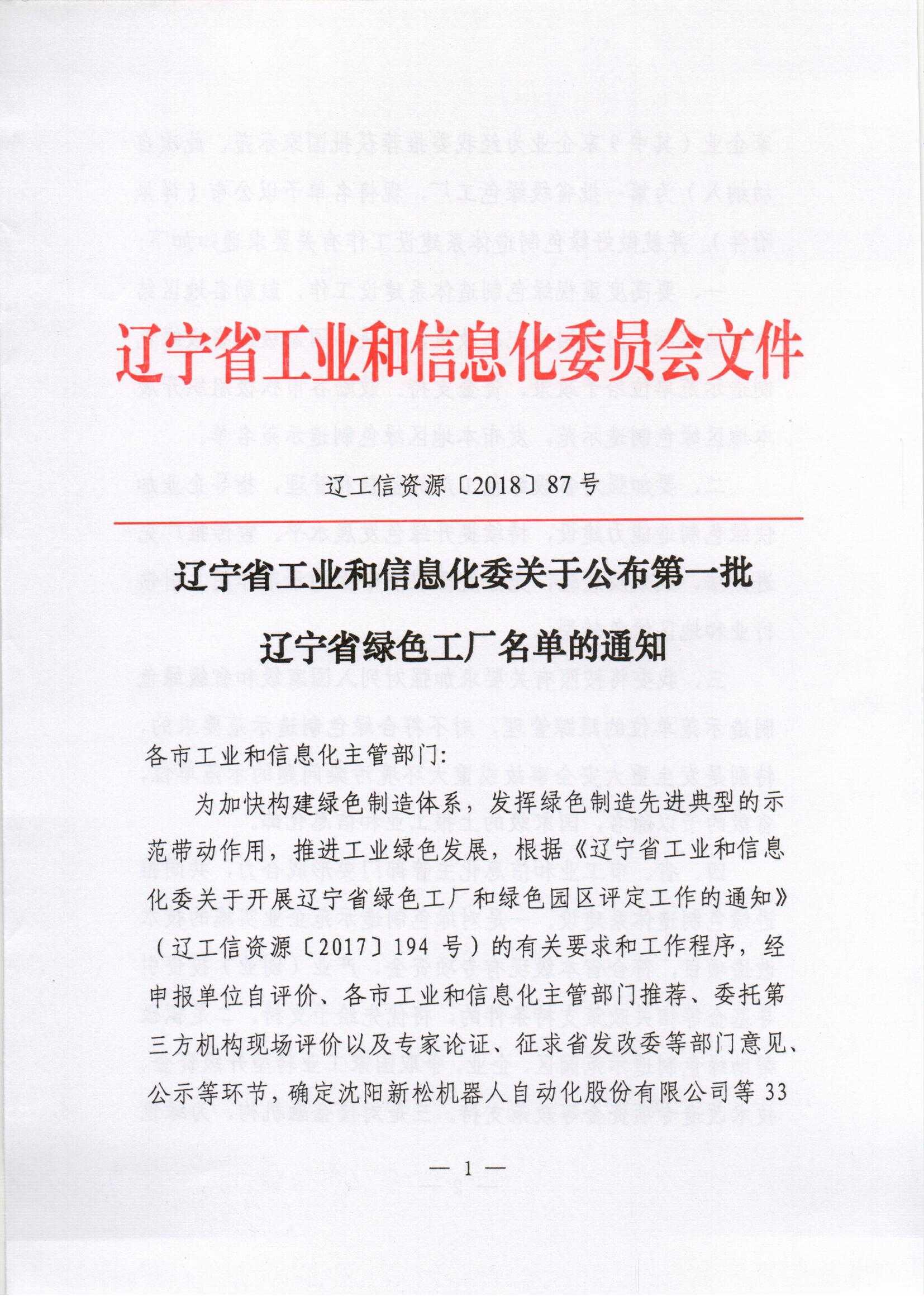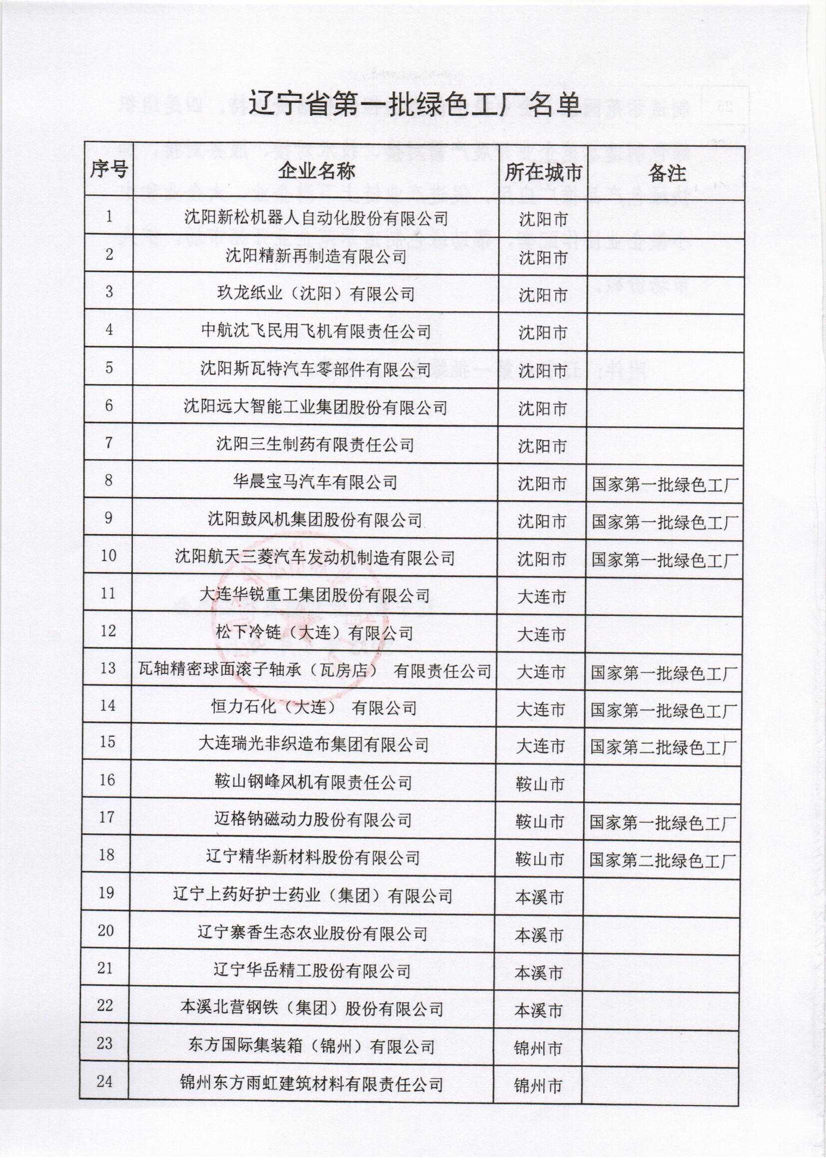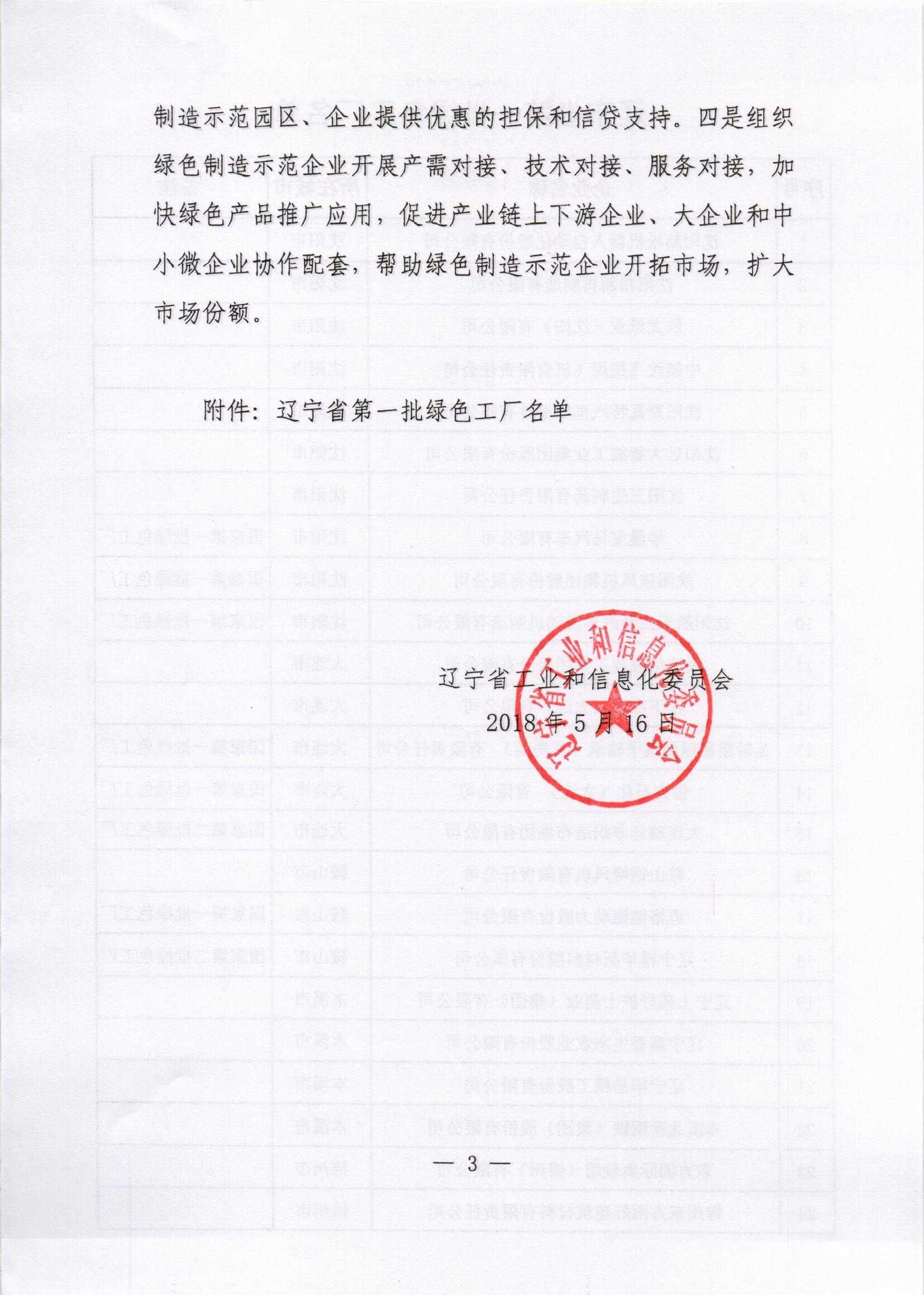 辽宁省工业和信息化委关于公布第一批辽宁省绿色工厂名单的通知